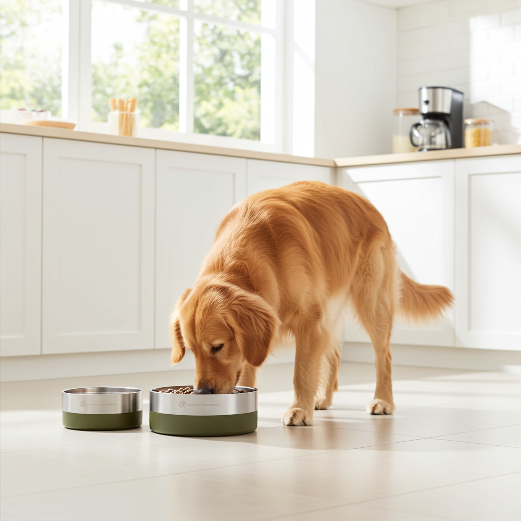 Der dunkelgrüne Edelstahl-Futternapf von Super by SpirePets bietet die perfekte Kombination aus Langlebigkeit und Eleganz und wurde speziell für mittelgroße Hunde entwickelt.